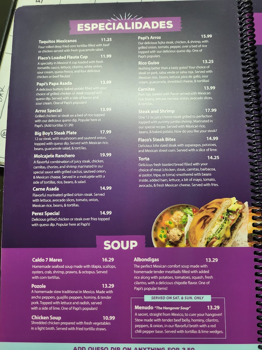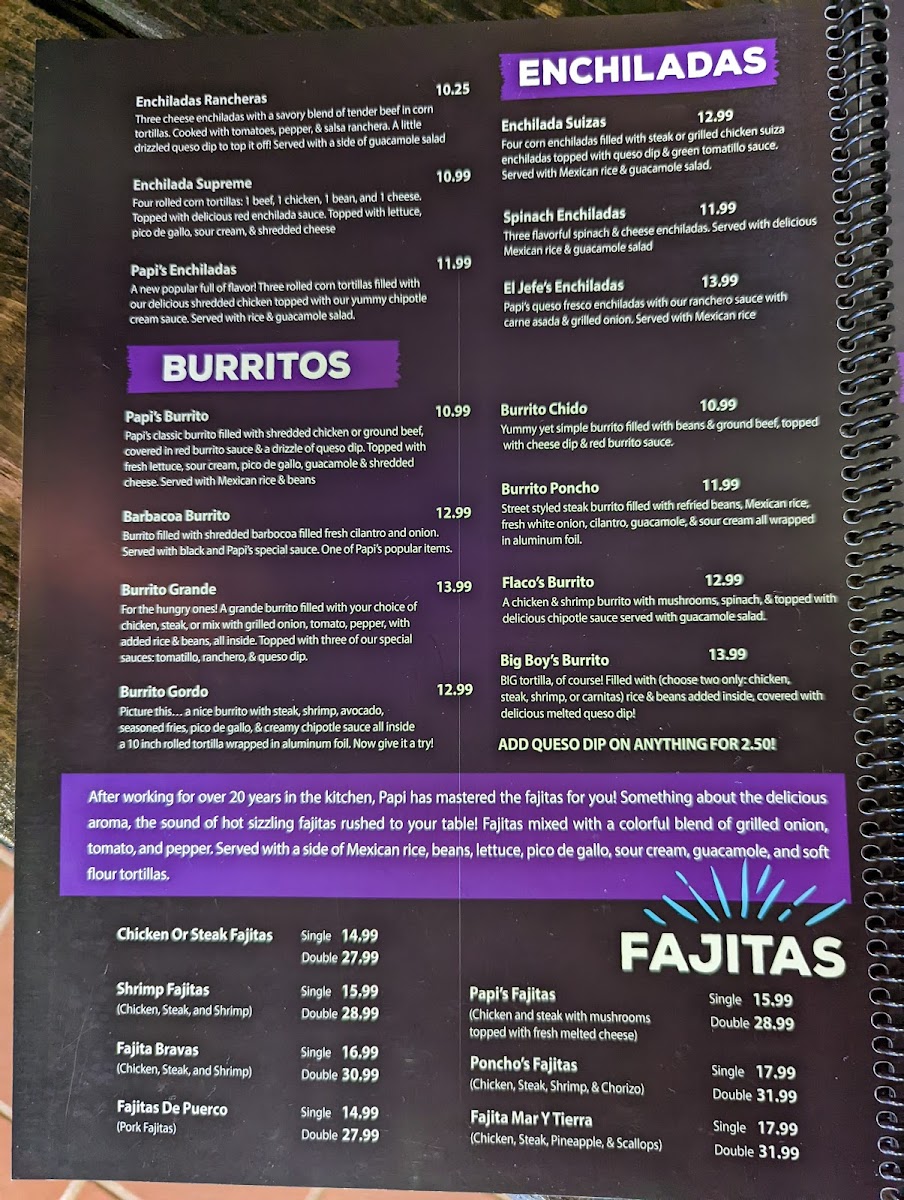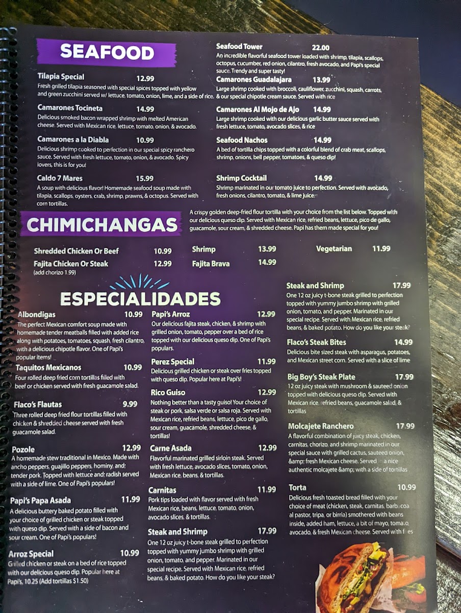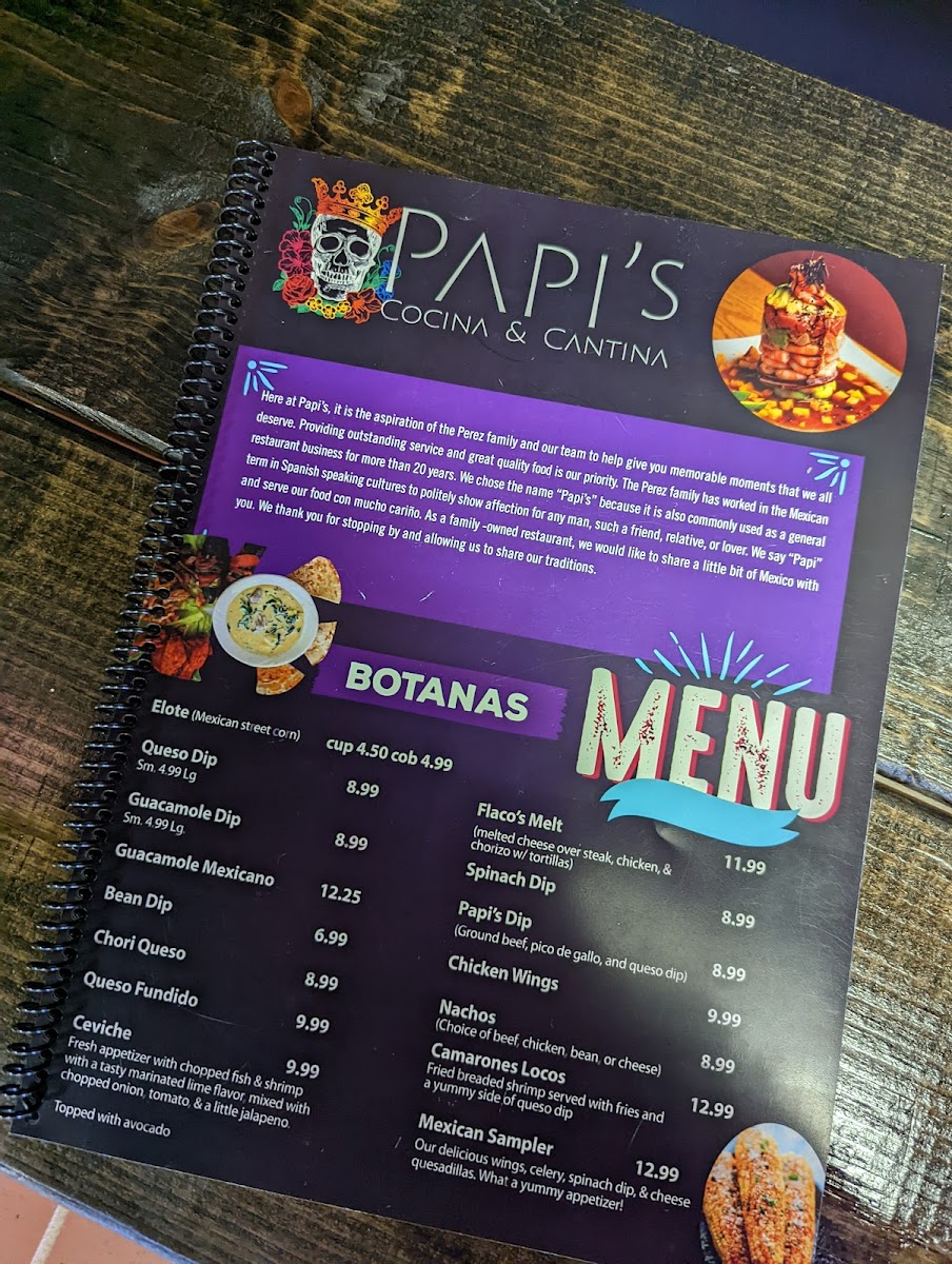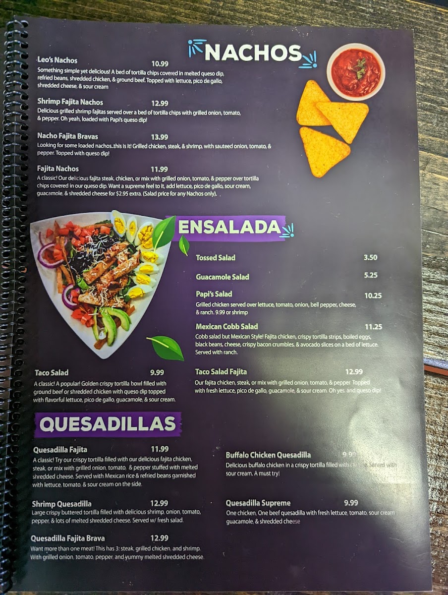 From a reviewer’s perspective, the menu at Papi’S Cocina & Cantina is an impressive showcase of variety and consistency, bringing together classic Mexican comfort food and bolder specialty dishes in one cohesive lineup. The meal often begins strongly with appetizers like Elote, Bean Dip, Chori Queso, Spinach Dip, and Queso Dip, setting a rich and flavorful tone. Nacho lovers are especially well cared for with options such as Leo's Nachos, Fajita Nachos, Nacho Fajita Bravas, and Shrimp Fajita Nachos, each offering generous toppings and satisfying portions. Freshness comes through in the salad selection, including Tossed Salad, Guacamole Salad, Papi's Salad, Taco Salad, and Taco Salad Fajita, which balance the heartier items nicely. The kitchen’s creativity shines in the specialties like Taquitos Mexicanos, Flaco's Loaded Flauta Cup, Papi's Papa Asada, Arroz Special, and Papi's Arroz, while traditional soups such as Caldo 7 Mares, Pozole, Chicken Soup, and Albondigas add comforting depth. Across the menu, guests can explore everything from Camarones Guadalajara, Camarones Tocineta, and Camarones A La Diabla in the seafood section, to crowd-pleasing classics like Quesadilla Supreme, Pollo Chipotle, Papi's Burrito, Enchiladas Rancheras, Burrito Grande, and sizzling Chicken Or Steak Fajitas. The thoughtful inclusion of combo meals, kids’ options, sides, and desserts such as Xango, Sopapilla, and Fried Ice Cream rounds out the experience. Overall, the menu feels comprehensive and inviting, making Papi’s Cocina & Cantina a reliable choice for anyone seeking a full, satisfying Mexican dining experience in Republic, Missouri.