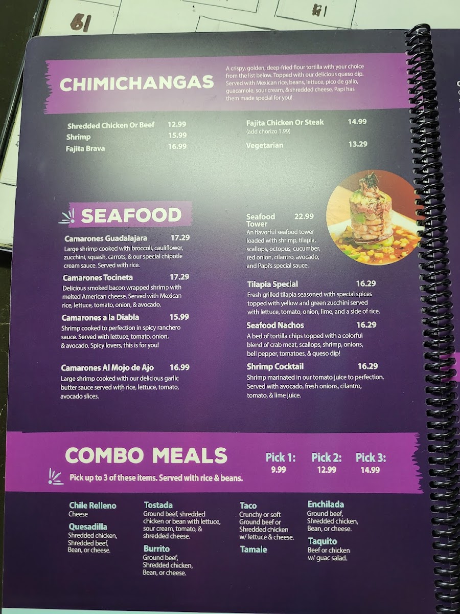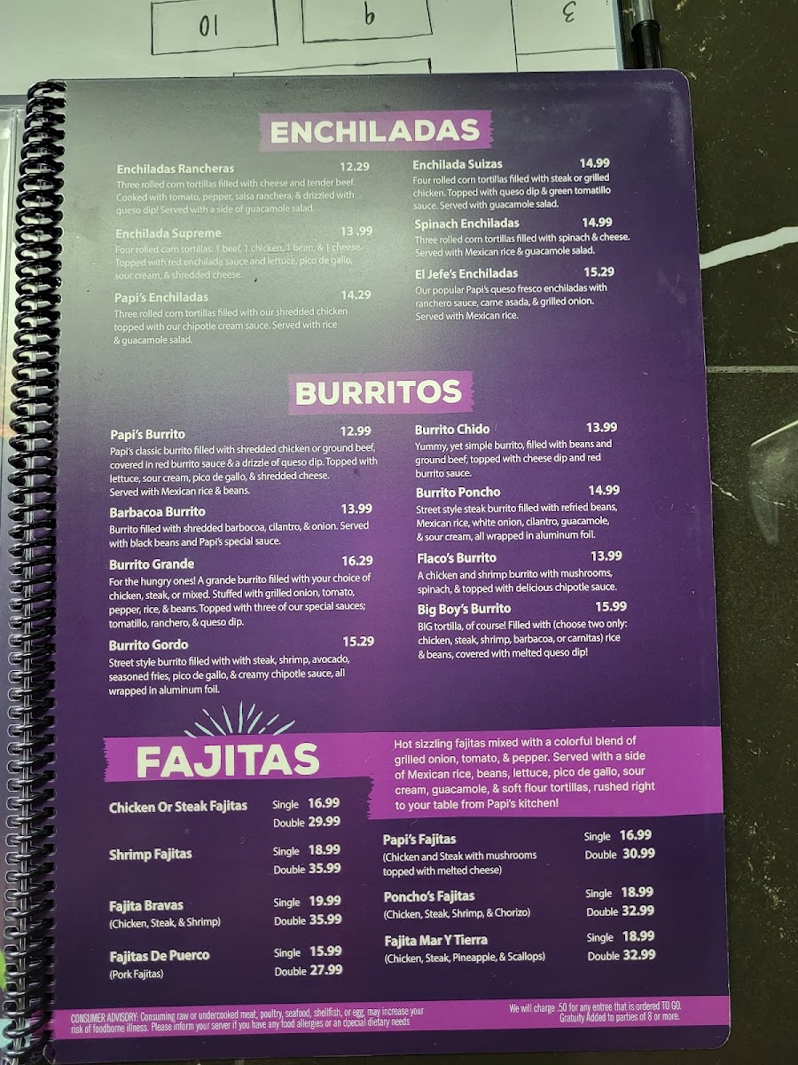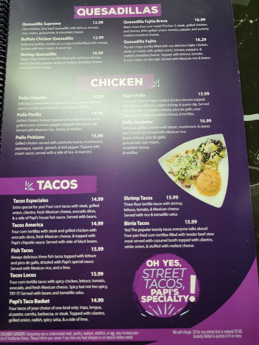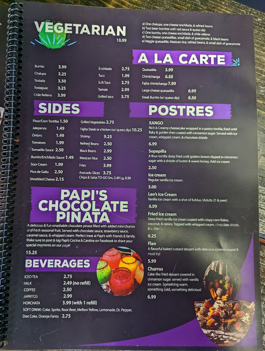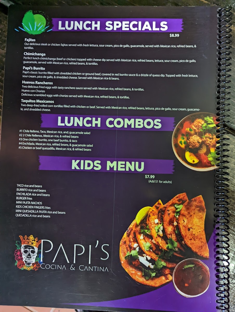 From a reviewer’s perspective, the menu at Papi’S Cocina & Cantina is an impressive showcase of variety and consistency, bringing together classic Mexican comfort food and bolder specialty dishes in one cohesive lineup. The meal often begins strongly with appetizers like Elote, Bean Dip, Chori Queso, Spinach Dip, and Queso Dip, setting a rich and flavorful tone. Nacho lovers are especially well cared for with options such as Leo's Nachos, Fajita Nachos, Nacho Fajita Bravas, and Shrimp Fajita Nachos, each offering generous toppings and satisfying portions. Freshness comes through in the salad selection, including Tossed Salad, Guacamole Salad, Papi's Salad, Taco Salad, and Taco Salad Fajita, which balance the heartier items nicely. The kitchen’s creativity shines in the specialties like Taquitos Mexicanos, Flaco's Loaded Flauta Cup, Papi's Papa Asada, Arroz Special, and Papi's Arroz, while traditional soups such as Caldo 7 Mares, Pozole, Chicken Soup, and Albondigas add comforting depth. Across the menu, guests can explore everything from Camarones Guadalajara, Camarones Tocineta, and Camarones A La Diabla in the seafood section, to crowd-pleasing classics like Quesadilla Supreme, Pollo Chipotle, Papi's Burrito, Enchiladas Rancheras, Burrito Grande, and sizzling Chicken Or Steak Fajitas. The thoughtful inclusion of combo meals, kids’ options, sides, and desserts such as Xango, Sopapilla, and Fried Ice Cream rounds out the experience. Overall, the menu feels comprehensive and inviting, making Papi’s Cocina & Cantina a reliable choice for anyone seeking a full, satisfying Mexican dining experience in Republic, Missouri.
